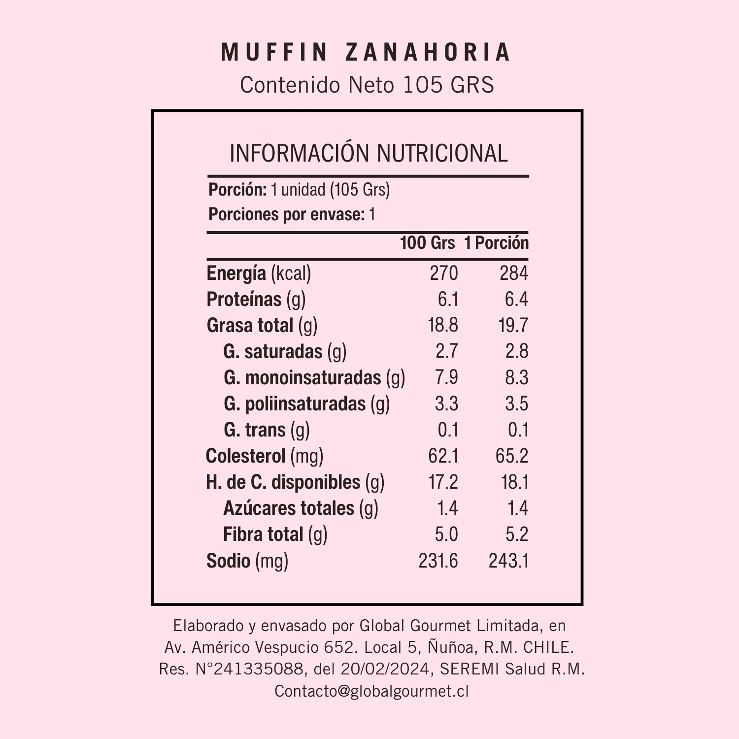 Mix de harinas sin gluten Zuitys, zanahoria, alulosa en polvo 100% pura, huevo, aceite, nueces, mantequilla, canela, harina de almendras, polvos de horneo, bicarbonato de sodio, vainilla natural, naranja, sal.